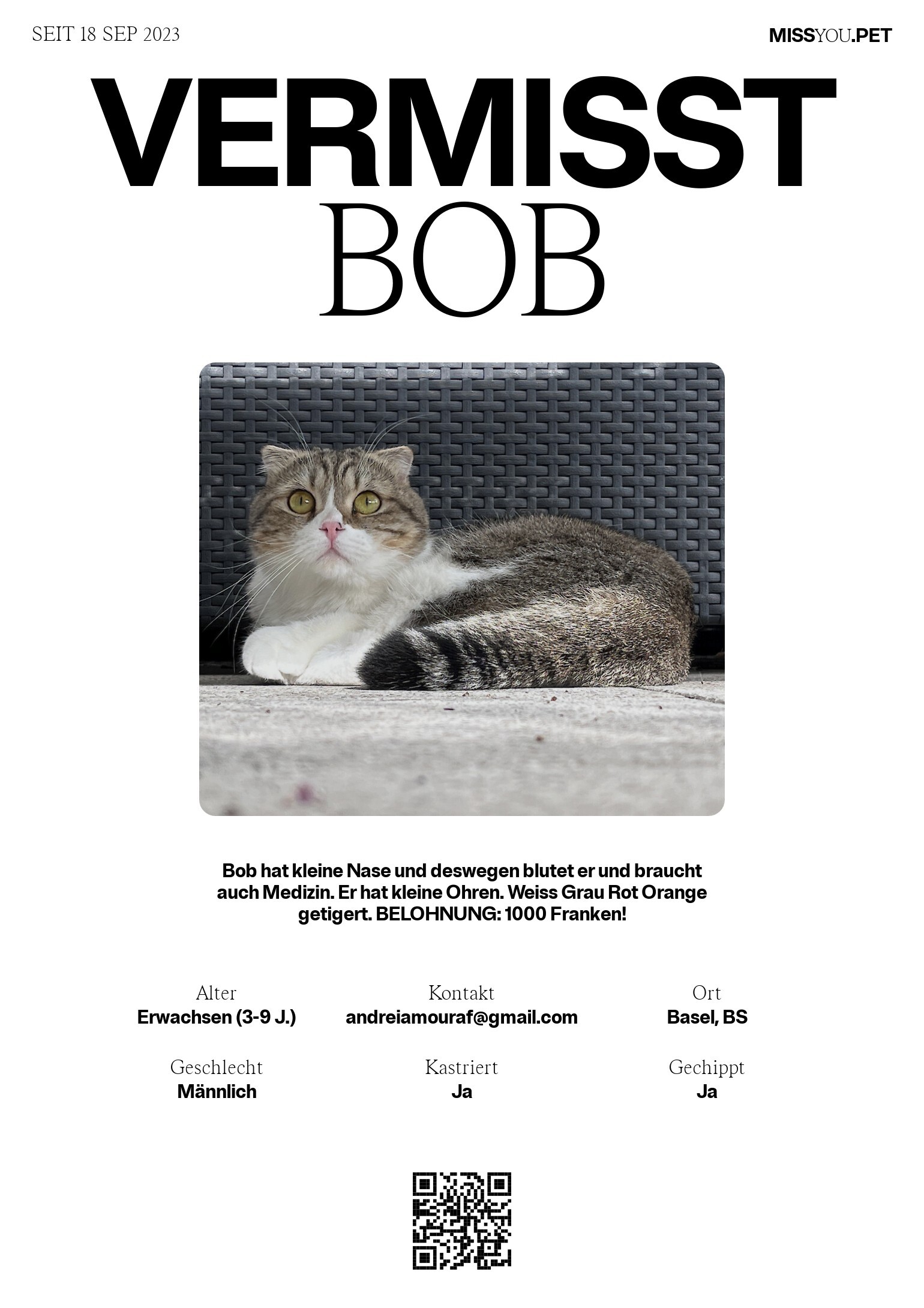 Bob hat kleine Nase und deswegen blutet er und braucht auch Medizin. Er hat kleine Ohren. Weiss Grau Rot Orange getigert. BELOHNUNG: 1000 Franken!