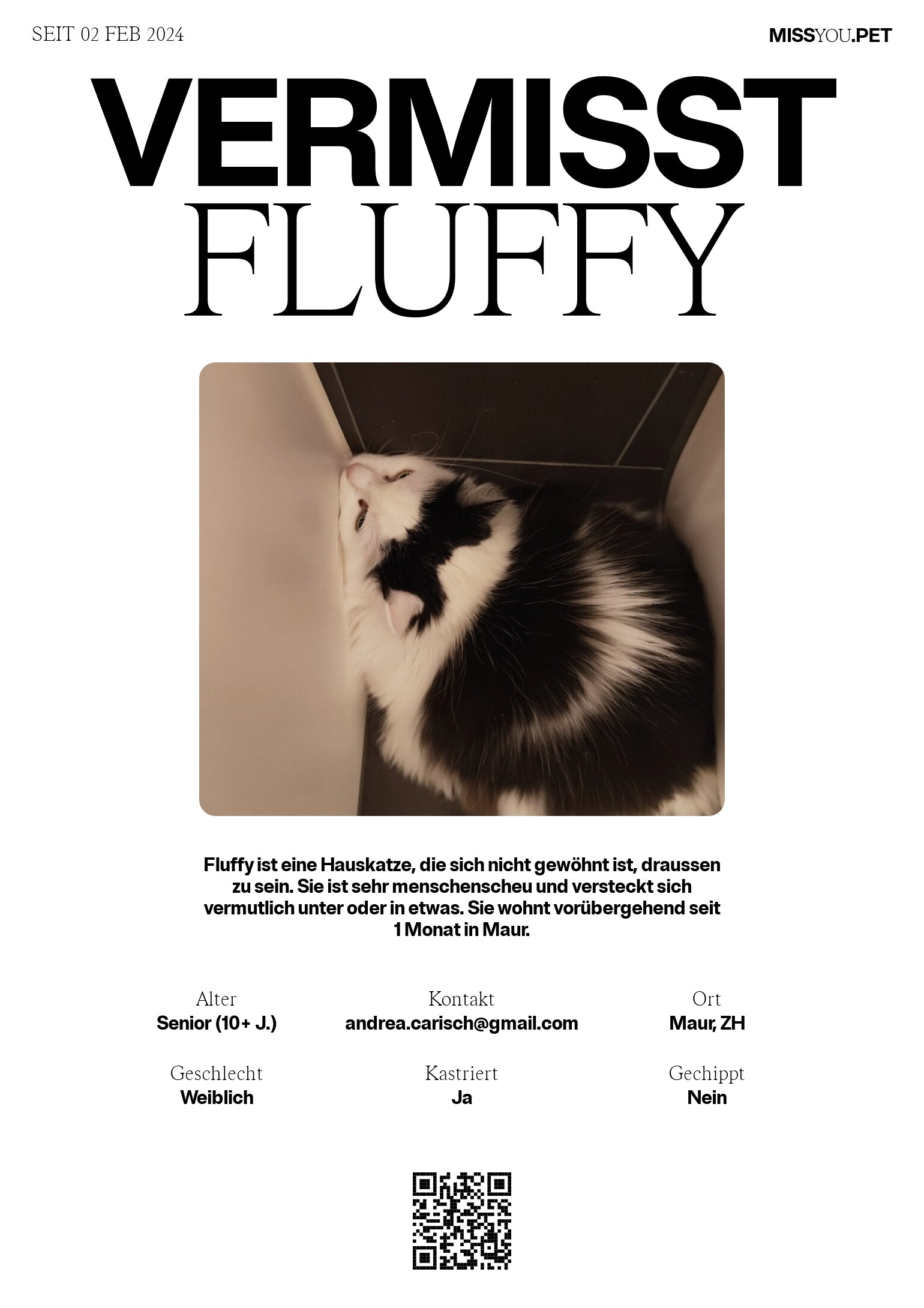 Fluffy ist eine Hauskatze, die sich nicht gewöhnt ist, draussen zu sein. Sie ist sehr menschenscheu und versteckt sich vermutlich unter oder in etwas. Sie wohnt vorübergehend seit 1 Monat in Maur.