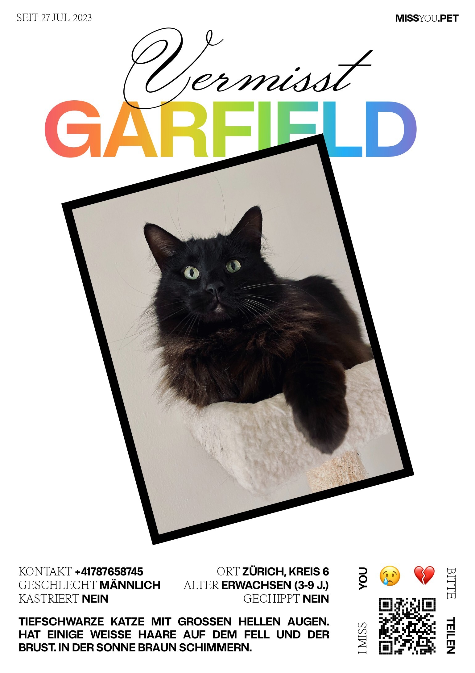 Tiefschwarze Katze mit grossen hellen Augen. Hat einige weisse Haare auf dem Fell und der Brust. In der Sonne braun schimmern.