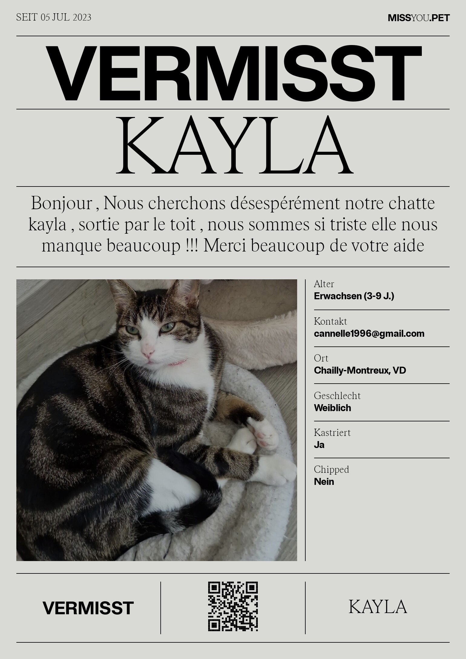 Bonjour , Nous cherchons désespérément notre chatte kayla , sortie par le toit , nous sommes si triste elle nous manque beaucoup !!! Merci beaucoup de votre aide
