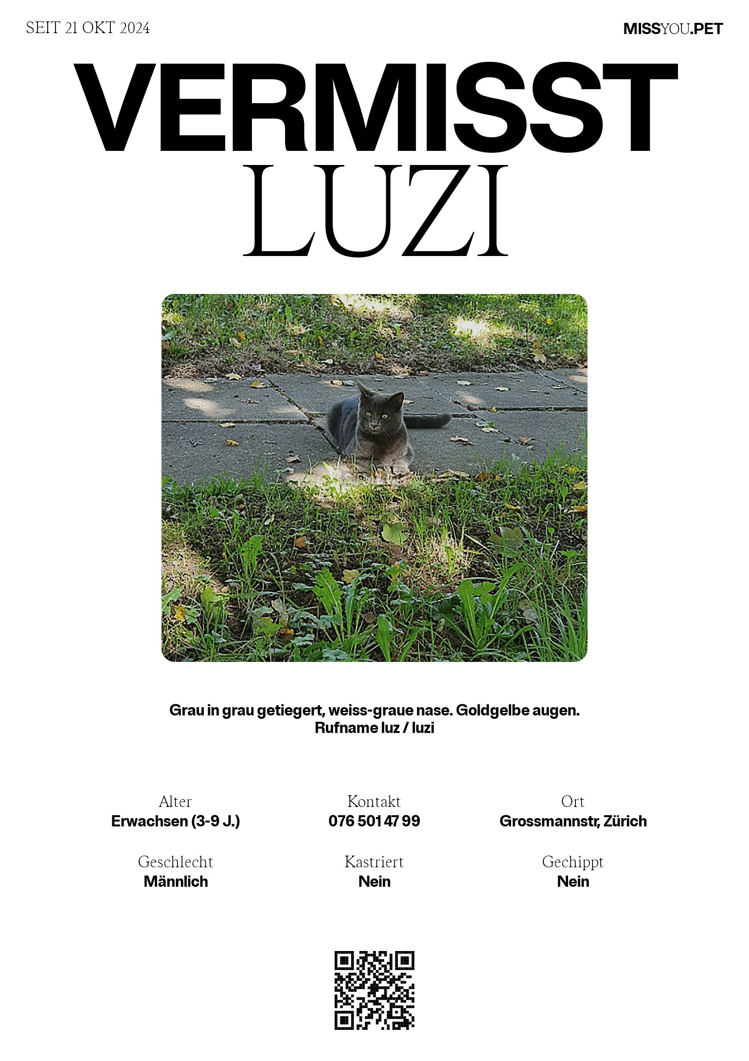 Grau in grau getiegert, weiss-graue nase. Goldgelbe augen. Rufname luz / luzi