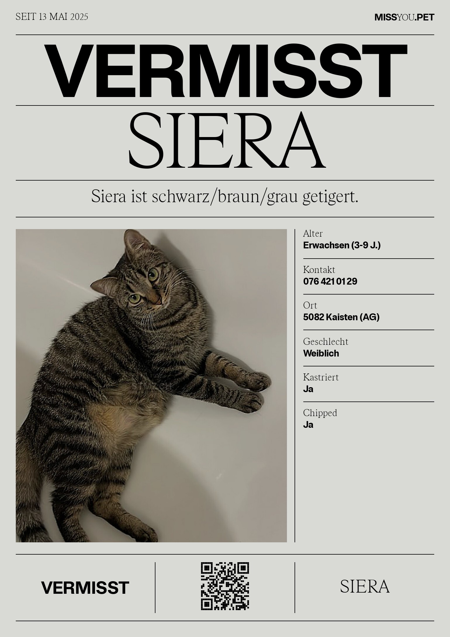 Siera ist schwarz/braun/grau getigert.