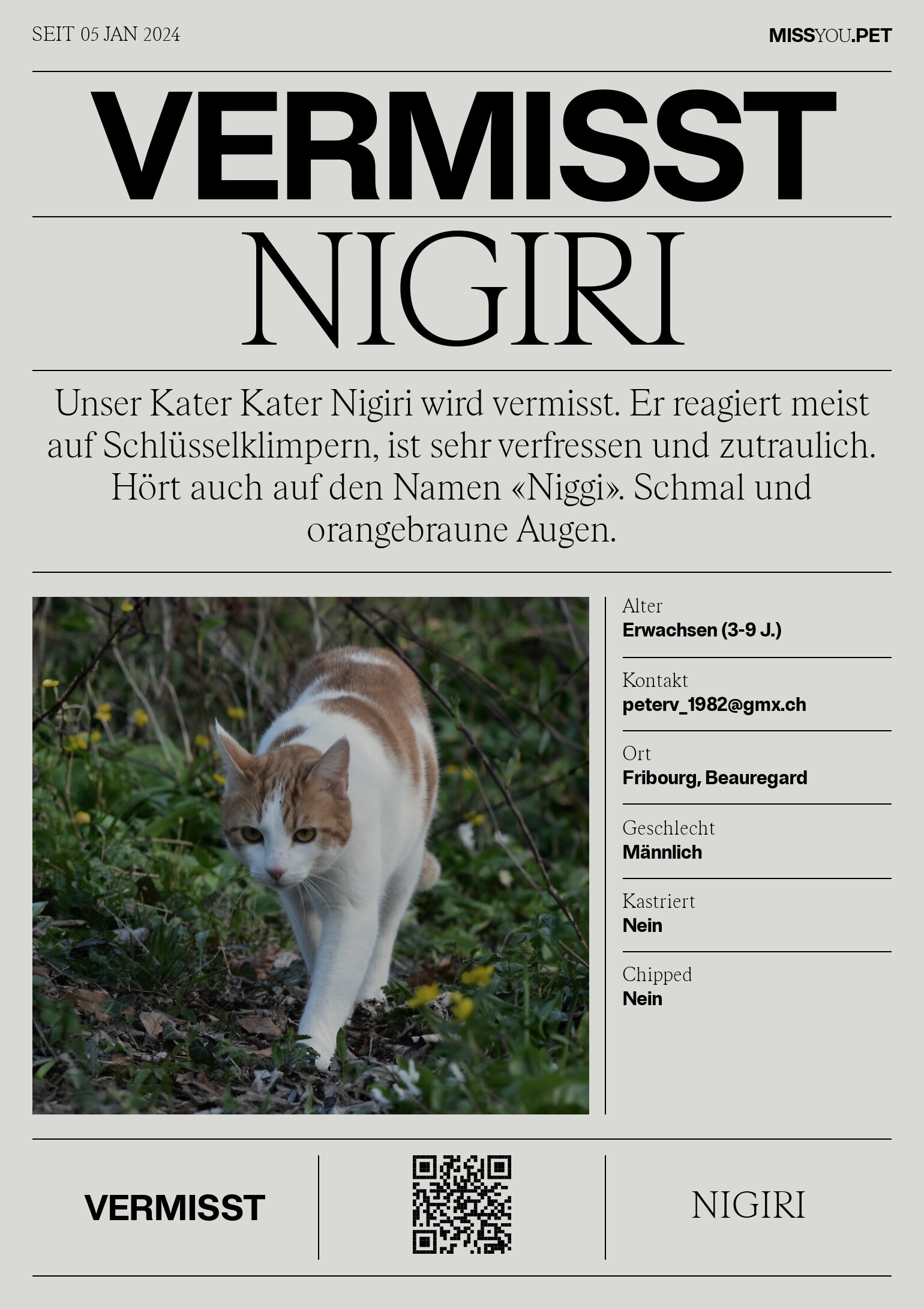 Unser Kater Kater Nigiri wird vermisst. Er reagiert meist auf Schlüsselklimpern, ist sehr verfressen und zutraulich. Hört auch auf den Namen «Niggi». Schmal und orangebraune Augen.