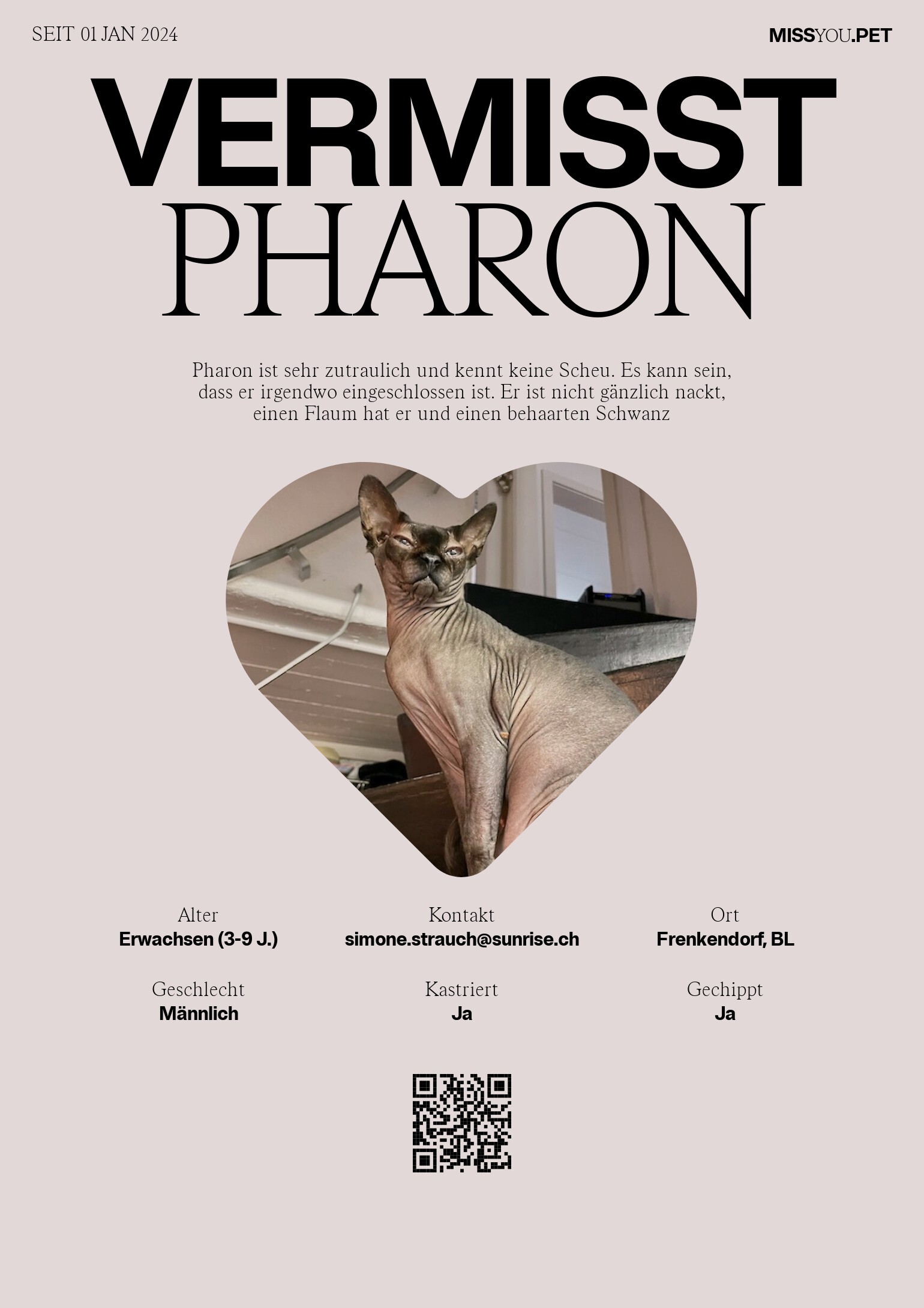 Pharon ist sehr zutraulich und kennt keine Scheu. Es kann sein, dass er irgendwo eingeschlossen ist. Er ist nicht gänzlich nackt, einen Flaum hat er und einen behaarten Schwanz