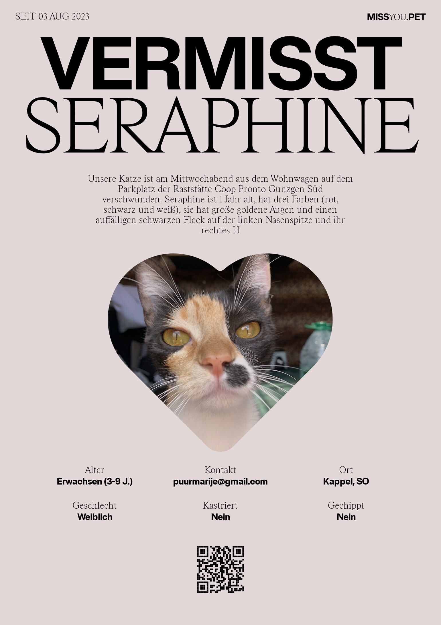 Unsere Katze ist am Mittwochabend aus dem Wohnwagen auf dem Parkplatz der Raststätte Coop Pronto Gunzgen Süd verschwunden. Seraphine ist 1 Jahr alt, hat drei Farben (rot, schwarz und weiß), sie hat große goldene Augen und einen auffälligen schwarzen Fleck auf der linken Nasenspitze und ihr rechtes H