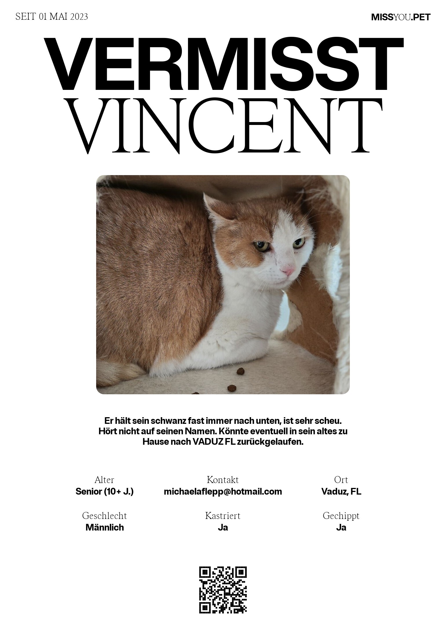 Er hält sein schwanz fast immer nach unten, ist sehr scheu. Hört nicht auf seinen Namen. Könnte eventuell in sein altes zu Hause nach VADUZ FL zurückgelaufen.